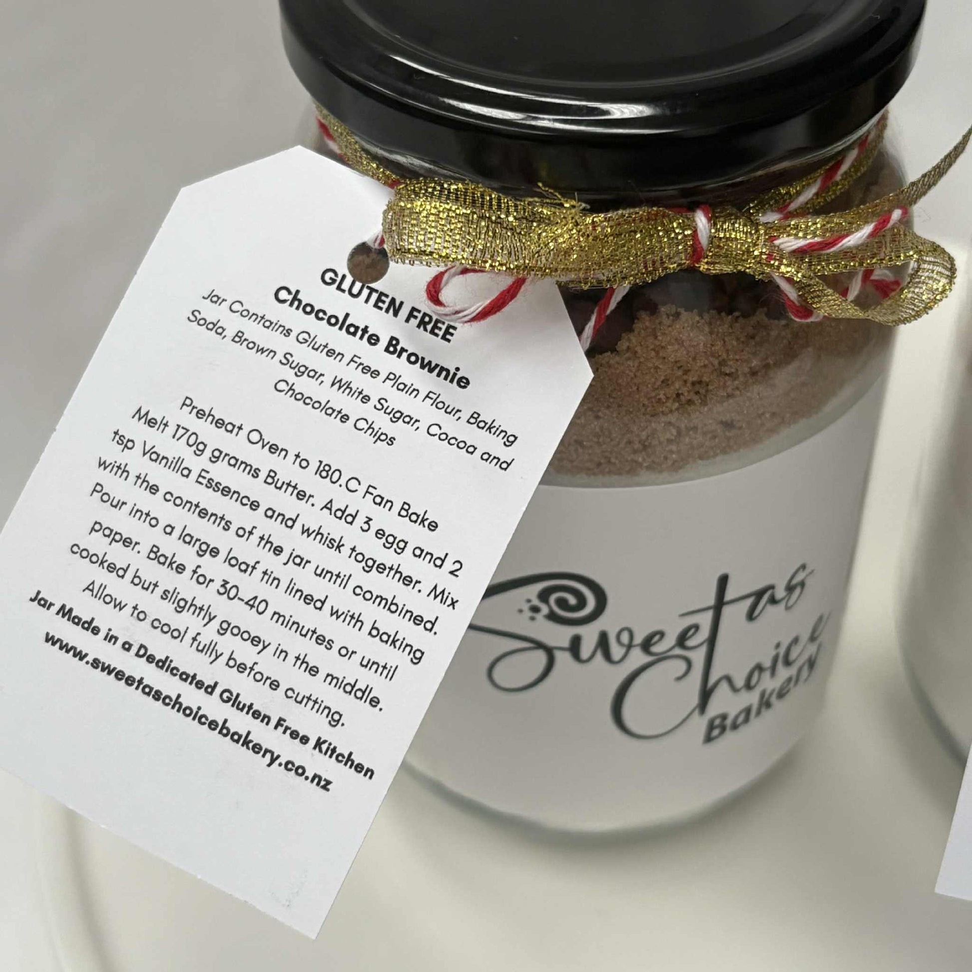 Chocolate Brownie Baking Jar Ingredients: Gluten Free Flour, Baking Soda (Sulphites), Brown Sugar, Caster Sugar, Chocolate Chips (Milk, Soy), Cocoa Powder