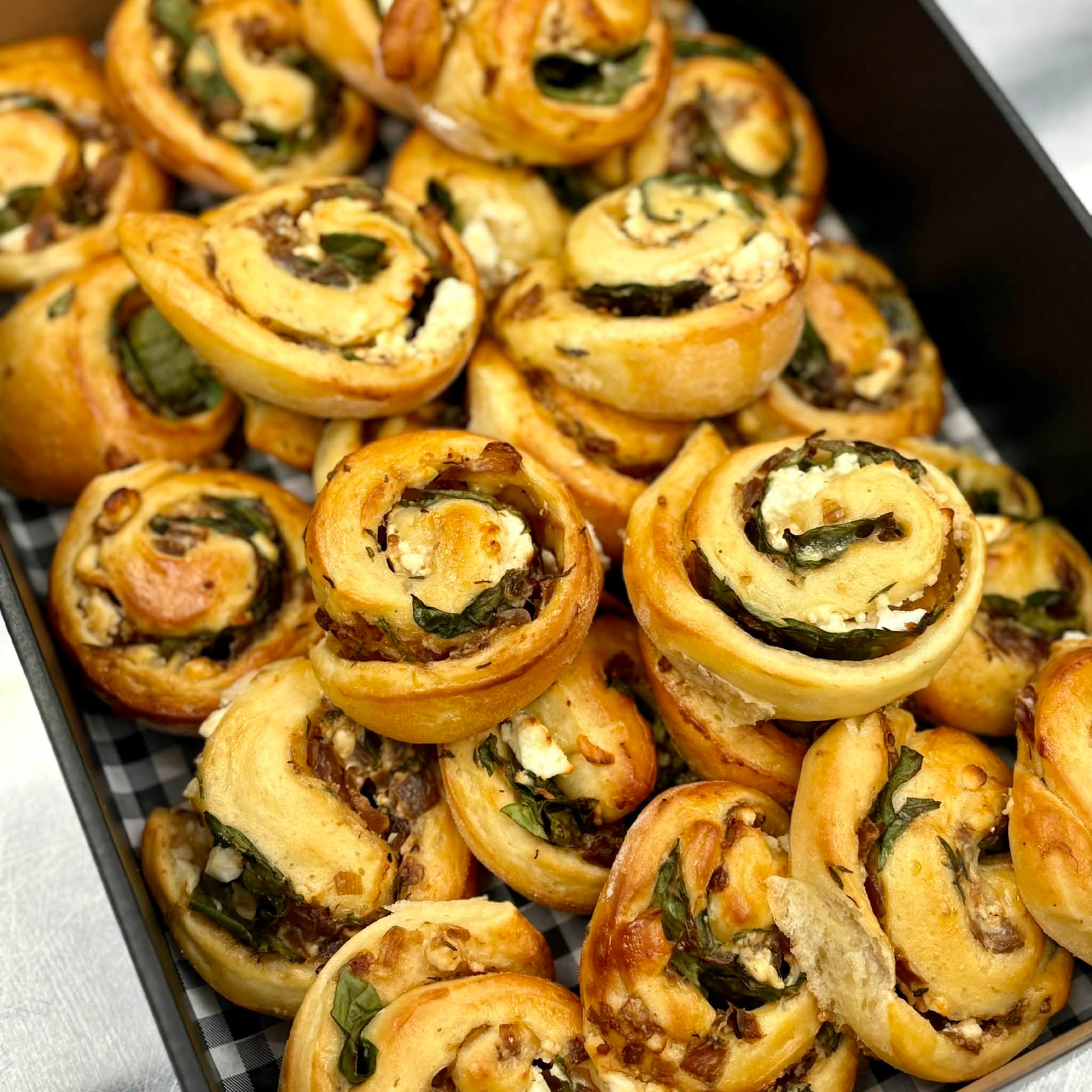 Our House Made Mini Spinach, Feta and Caramelised Onion Brioche Scrolls Platter Comes in Our Disposable Catering Box